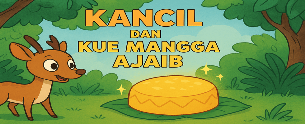 Di bawah pohon besar, Kancil menemukan sebuah kue mangga bulat yang cantik, berkilauan seperti emas.